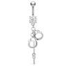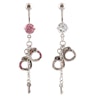Cumpără acest jucăuș cercel de buric cu o piatră mare și un set de cătușe cu o cheie făcând parte pandantiv. Aceste cătușe sunt decorate cu pietre frumoase pe toată lungimea marginii. Ele sunt disponibile în culoarea roz sau transparent, trebuie doar să-ți selectezi culoarea favorită.