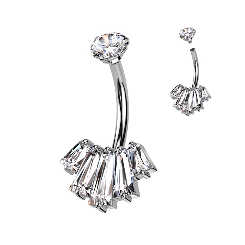 Stilat cercel de buric cu pietre din zirconiu în tăietură baghetă dispuse într-un model evantai tip art deco. Materialul lui, oțelul chirurgical, asigură durabilitate și confort la purtare. Cu o grosime a firului de de 1.6 mm și o lungime de 10 mm, se potrivește perfect cu majoritatea piercingurilor de buric. Firul intern face ca inserarea în piercing să fie ușoară și confortabilă. Disponibil în trei culori clasice la alegere: lucios, auriu și rose gold. Este un stil atemporal care va completa orice ținută.