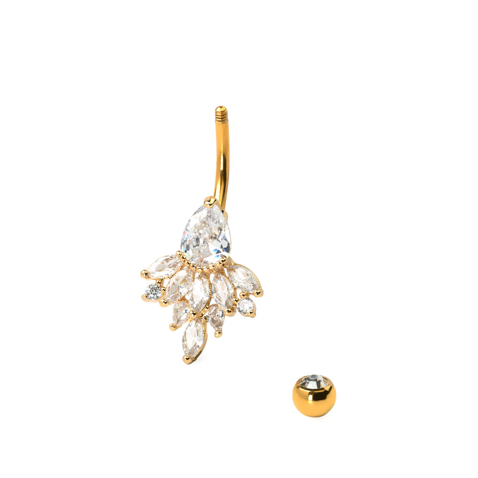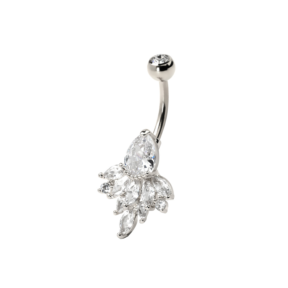 Această bijuterie pentru buric este pur și simplu superbă. Pentru început, este alcătuită dintr-o bară curbată de 10 mm lungime și o bilă superioară, cu o piatră de culoare albă. Dar dacă o privești mai de aproape, vei vedea că include mai multe pietre alungite, susținute de o piatră mai mare, în formă de lacrimă. Toate pietrele sunt sculptate asemenea diamantului, pentru că lumina să se reflecte în ele din mai multe unghiuri distincte. Pietrele inferioare sunt distribuite sub formă de trei rânduri care se termină cu o piatră alungită, în partea inferioară.