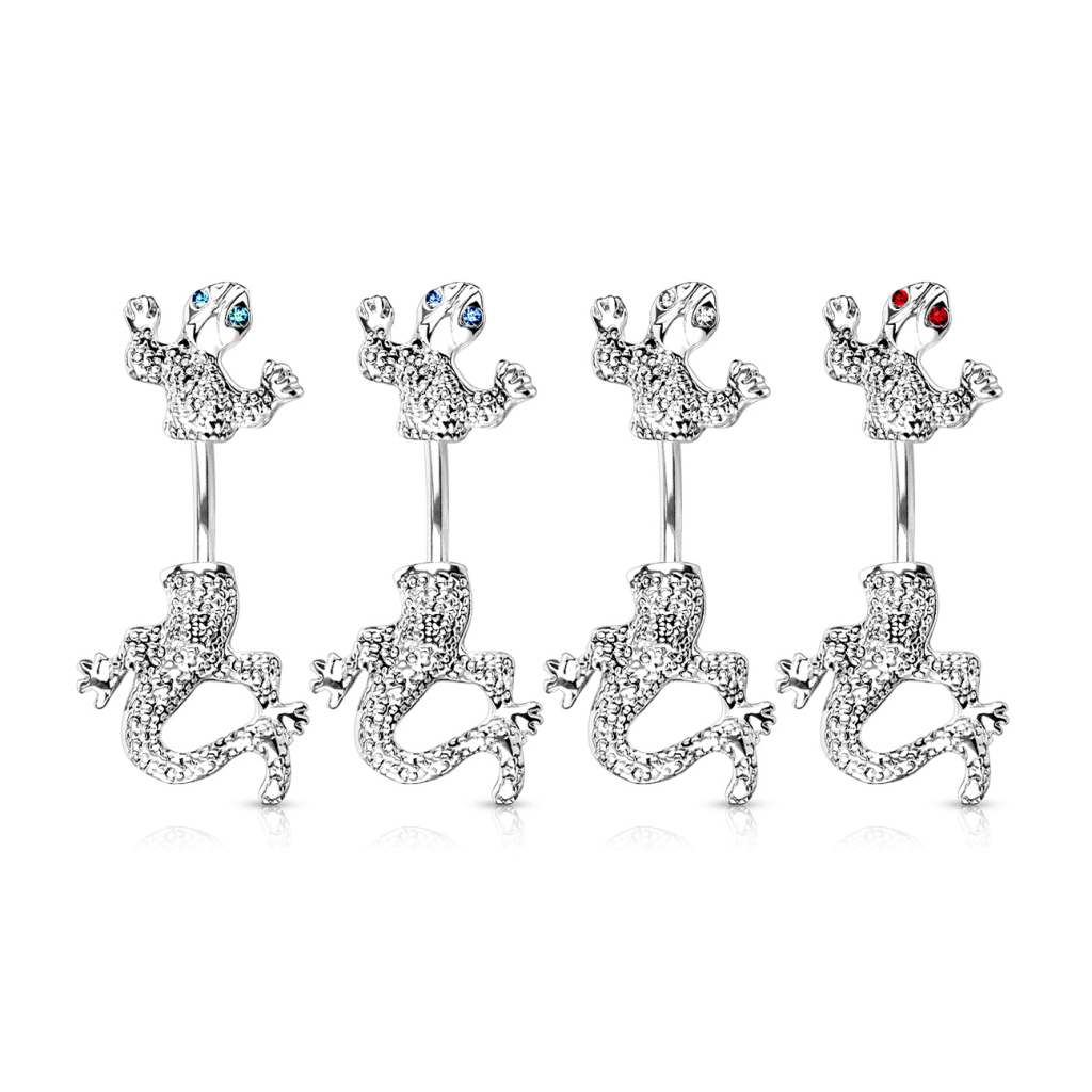 Îți plac bijuteriile exclusiviste? Atunci vei iubi aceasta incredibilă bijuterie pentru gaura ta din buric. Este făcută din oțel chirurgical și are forma unei șopârle sexy. Partea de jos a corpului șopârlei este parte din bila de jos, în timp ce bila de sus este partea de sus a șopârlei. În afară de asta, are numeroase detalii care fac acest cercel de buric unic, cum are fi ghearele și solzi. Aceasta mică șopârlă are de asemenea și ochi frumoși pe care îi poți alege din albastru, roșu sau alb. Sunt două pietre tăiate cu mai multe unghiuri ce creează un contrast fabulos cu restul cercelului de buric, mai ales ochii roșii.