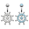 Găsești aici o simpatică și frumoasă tijă din oțel chirurgical strălucitor cu o timonă atât de bine făcută de arată ca una reală. Este decorată cu o mare, frumoasă și centrală piatră și un cerc perfect de pietre la fel pe marginea roții. Pietrele împreună cu mânerele formează un model drăguț de timonă.