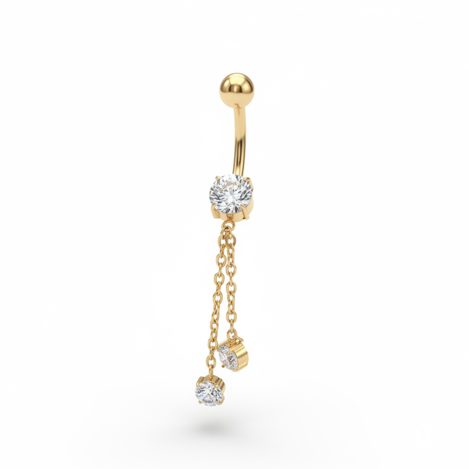 Nu orice bijuterie de buric este făcută să întoarcă toate capetele, dar acest cercel de buric din titan cu lanțuri și pietre este, cu siguranță. Un barbell din titan, elegant, cu o piatră strălucitoare, ce se continuă cu două lanțuri delicate care atârnă și reflectă lumina la fiecare mișcare. Glamour fără efort, de ce nu?