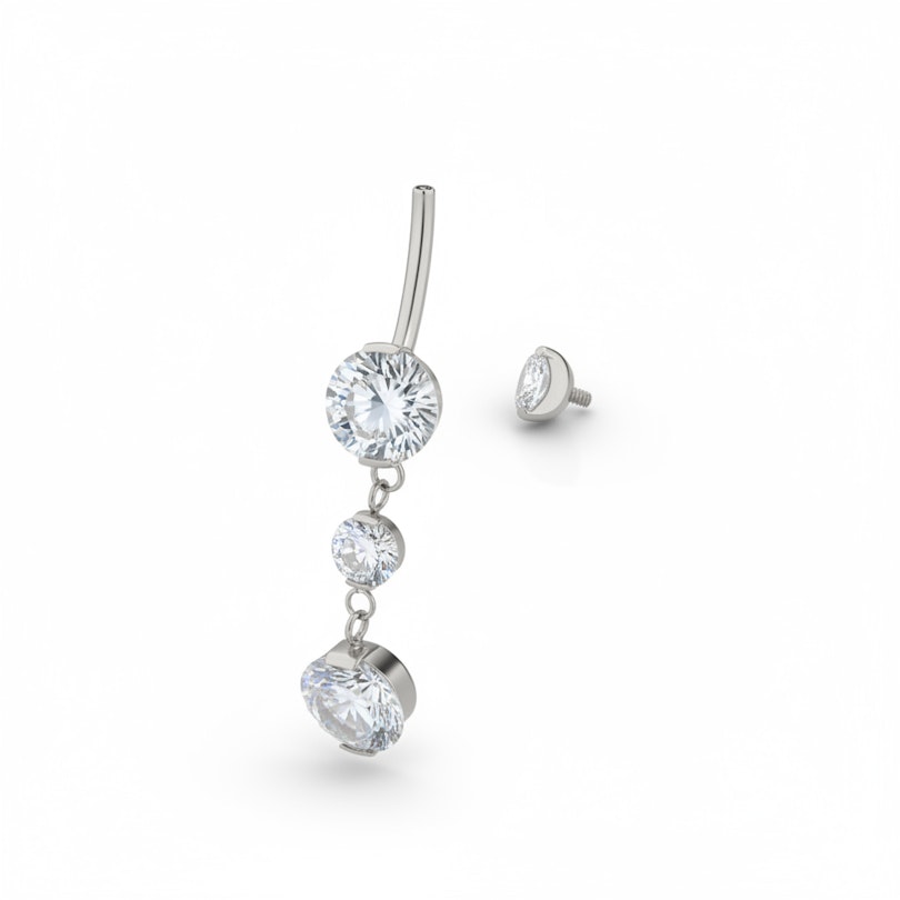 Acest superb cercel de buric din titan cu pandant are 4 pietre incrustate, câte una în fiecare bilă și două în pandant. Lungimea totală a părții de jos a bijuteriei - de la vârful bilei de jos până la partea de jos a pandantului are puțin peste 3 cm. Bijuteria are un tip de închidere cu fir intern, ceea ce înseamnă că numai tija fină trece prin piercingul tău, apoi partea de sus este înșurubată în ea pentru a o fixa. Titanul este atât hipoalergenic, cât și rezistent la apă, așadar bijuteria este perfectă pentru zilele petrecute la piscină.