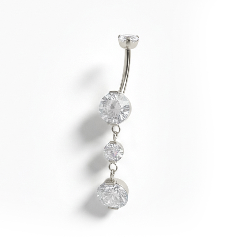 Acest superb cercel de buric din titan cu pandant are 4 pietre incrustate, câte una în fiecare bilă și două în pandant. Lungimea totală a părții de jos a bijuteriei - de la vârful bilei de jos până la partea de jos a pandantului are puțin peste 3 cm. Bijuteria are un tip de închidere cu fir intern, ceea ce înseamnă că numai tija fină trece prin piercingul tău, apoi partea de sus este înșurubată în ea pentru a o fixa. Titanul este atât hipoalergenic, cât și rezistent la apă, așadar bijuteria este perfectă pentru zilele petrecute la piscină.