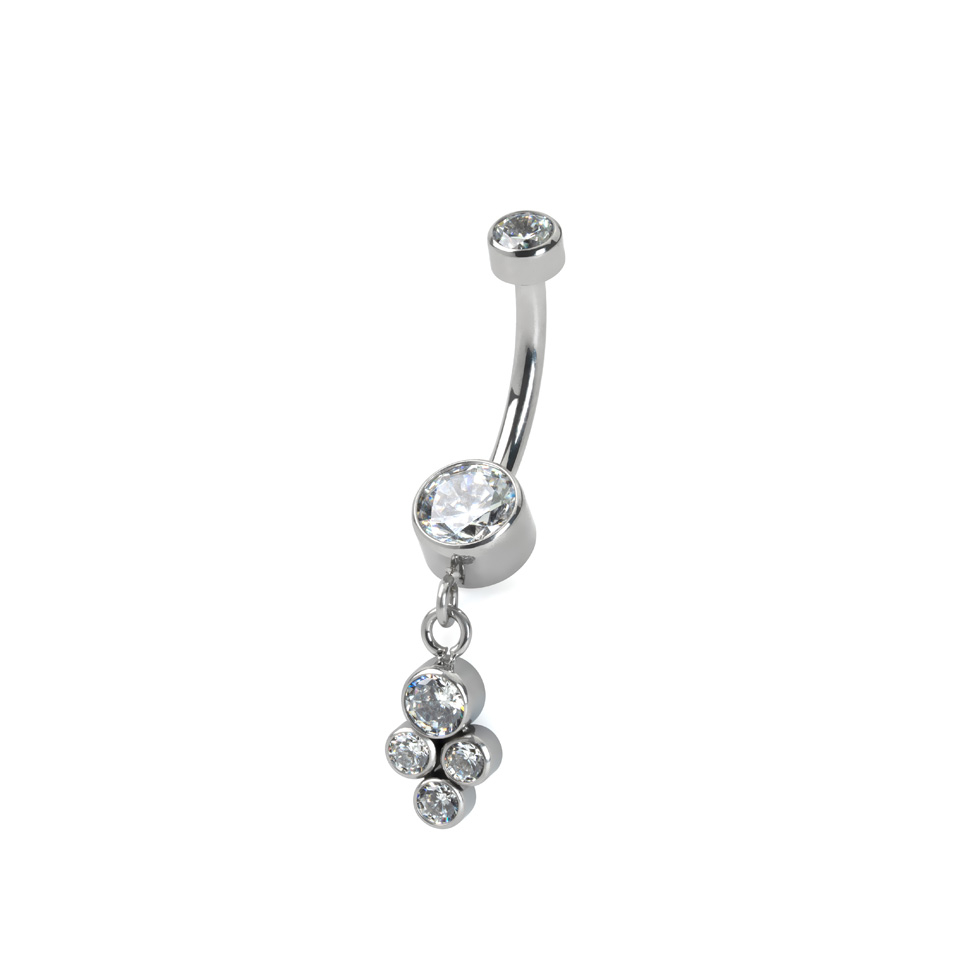 Acest cercel de buric emană extravaganță prin cele patru pietre care atârnă de o piatră strălucitoare mai mare; deasupra acesteia din urmă se află o altă piatră ce formează vârful cu fir interior al bijuteriei.