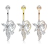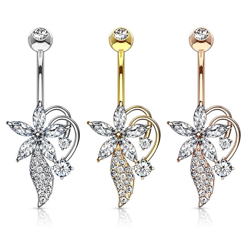 Acest cercel de buric vine într-un design simplu cu o barbell curbata și o bilă în vârf, cu o floare decorativă și o floare cățărătoare în capătul de jos. Cercelul de buric are dimensiunile standard ale cerceilor de buric; o bară de 14g (1.6 mm) și o lungime de 3/8 inches (10 mm). Barbell curbată și bila sunt făcute din oțel chirurgical, în timp ce restul este creat din alamă. Părțile au fost ulterior suflate cu aur - sau cu rodiu ca în caz acestui model frumos auriu. Floarea din capătul de jos are cinci frunze, unde cinci frumoase pietre ovale sau pietre marchize au fost plasate. Crengile apar din spatele floarei și se îndoaie puțin în față, unde atârnă cu o floare pe fiecare vârf. În plus, sub mai apare ceva ce arată ca o frunză răsucită, care este de asemenea decorată cu pietre transparente.