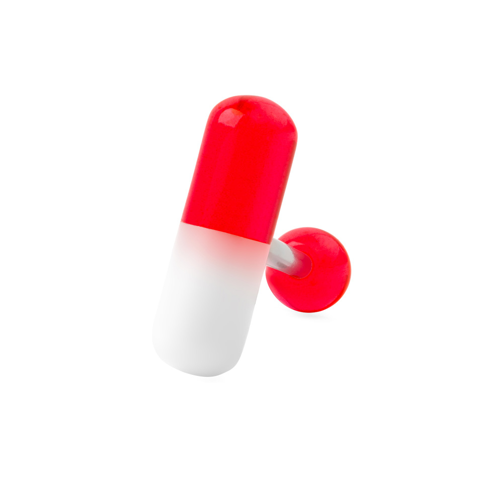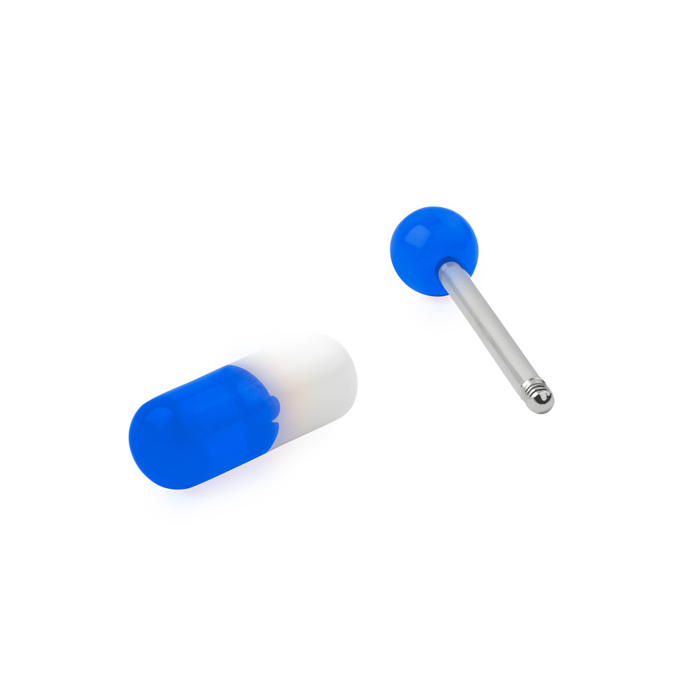 Acrilul este un material care în afară că este fără nichel, și este cea mai bună opțiune pentru piercing-ul tău de limbă. Mărimea capsulei bicolore este inspirată de una reală de 16 mm și grosime de 5 mm. Dar nu are legătură cu medicamentele normale. Capsula originală este disponibilă în șapte culori. O parte din pastilă este albă în toate modelele, pe cealaltă o poți alege chiar tu.