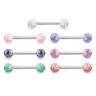 Cercel de limbă din oțel chirurgical cu bile din acril în culori diferite.