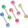 Acest model fantastic este disponibil în cinci culori diferite. Bilele sunt făcute din acril, și bara este din oțel chirurgical, deci este un model sigur. Din moment ce oțelul chirurgical nu eliberează nichel, nu poate dăuna organismului. În plus, acrilul are avantajul că este un material moale care îți va proteja dinții dacă te lovești.
