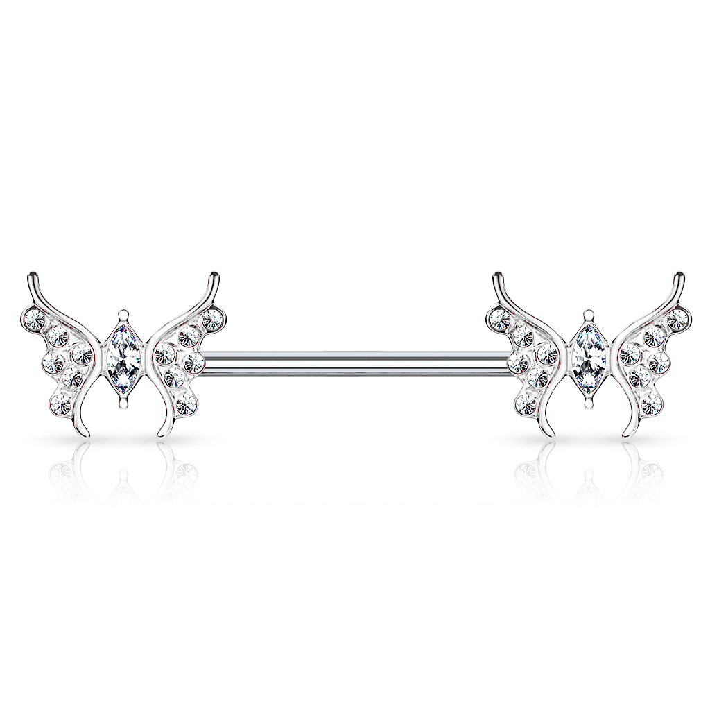 Dacă ești în căutarea celor mai speciale modele pentru piercing-ul tău de sân, avem o ofertă frumoasă. Bijuteria consistă într-o bară dreaptă de 11/16 inches (17 mm). La fiecare capăt stă un mic fluture cu aripi frumoase. Corpul fluturelui a fost decorat cu mici pietre marchiză, care urmăresc forma corpului foarte bine. Aripile sunt decorate cu mici pietre transparente ce se potrivesc cu piatra mare din mijloc.