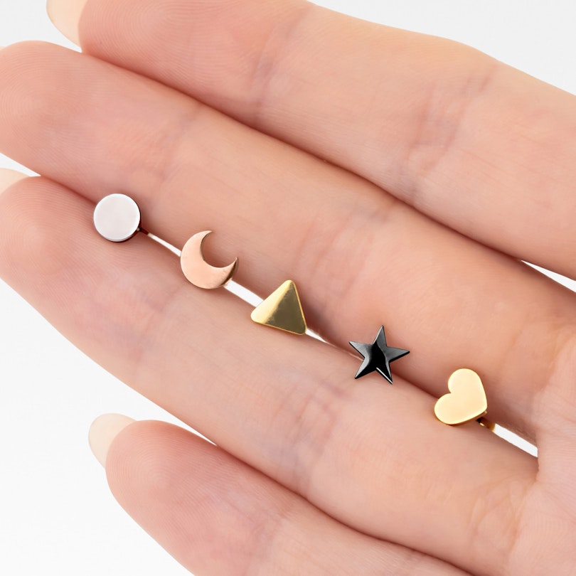 Am comandat mai multe tipuri (inimă, jumătate de lună, disc, stea) în culori negru, gri și care își schimbă culoarea. Din cauza păreri E52ter am fost puțin nervos în legătură cu steaua (o port în lobul urechii ca lobe), că ar putea să mă înțepe, dar din fericire nu m-a înțepat niciodată, nu presează în timpul somnului, așa că sunt foarte mulțumit de ele, este ușor să le pun și să le scot, sunt complet mulțumit de ele.