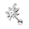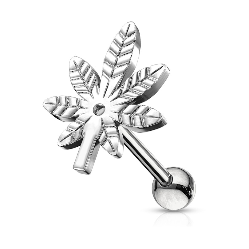 Acest frumos piercing de ureche consistă într-o bară dreaptă lungă de 1/4 inches (6 mm) ce prezintă o frumoasă frunză în capăt. Punem ghici că este o frunză de cânepă deoarece este în forma sa caracteristică. Dar nu vrem să încurajăm folosirea canabisului, de aceea nu zicem că este o frunză de marijuana ca să evităm certuri :)