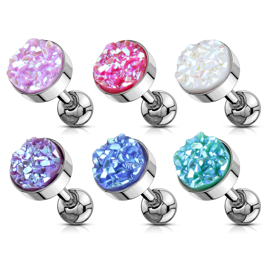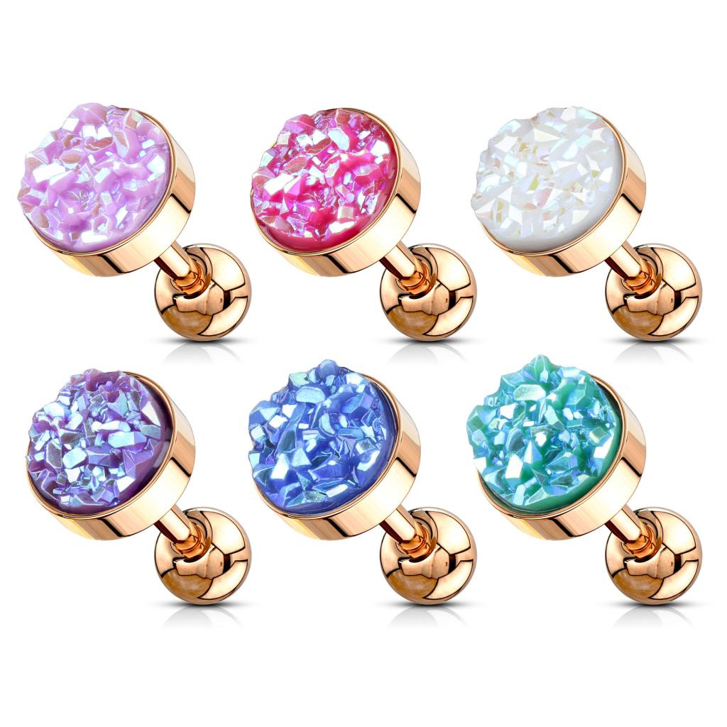Acesta prezintă o piatră druzy, care nu este tocmai o piatră, ci mai degrabă o formațiune cu mici cristale. Piatra druzy este disponibilă în multe culori diferite. Cea mai bună parte este ca nu vei avea doar o culoare, ci o combinație de frumoase nuanțe de mici cristale. Cristalele reflectă lumina creând un efect fantastic.