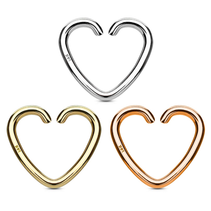 Poți cumpăra această inimă în versiuni diferite, în care poți alege tipul de aur ca și grosimea care se potrivește cu piercing-ul tău. Măsurile interioare ale acestei inimi sunt de 10 mm lățime pe o înălțime de 9 mm. Toate modelele au aceeași mărime, exceptând gabaritul. Poți purta această inimă în majoritatea piercing-urilor tale, dar ar arăta mai bine probabil în tragus, helix și piercing-ul daith.