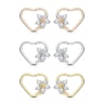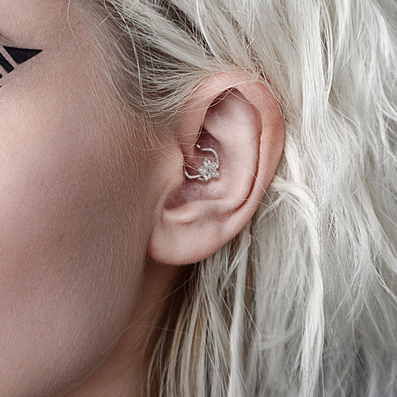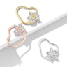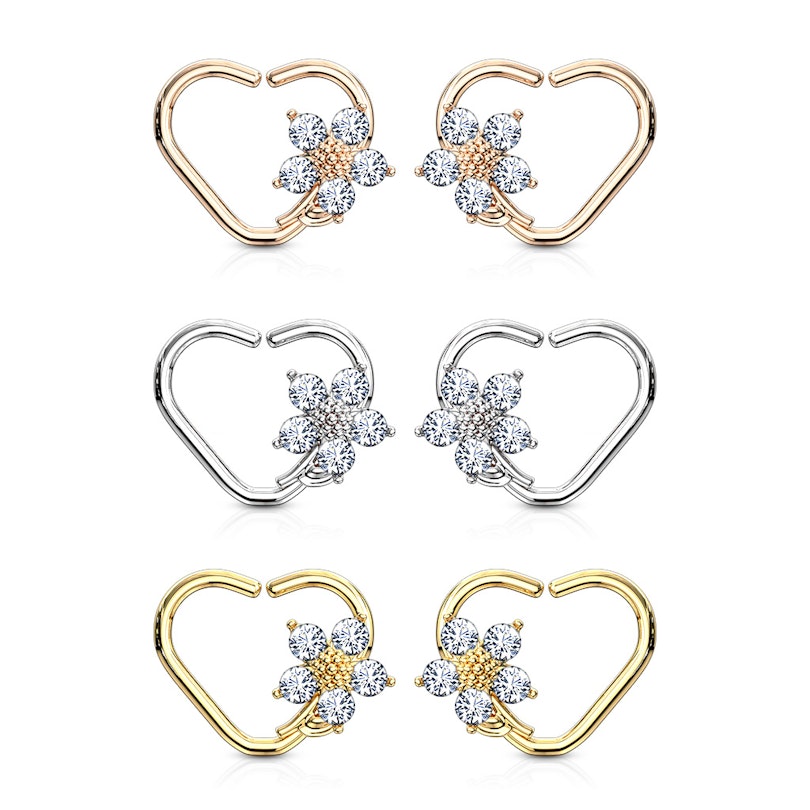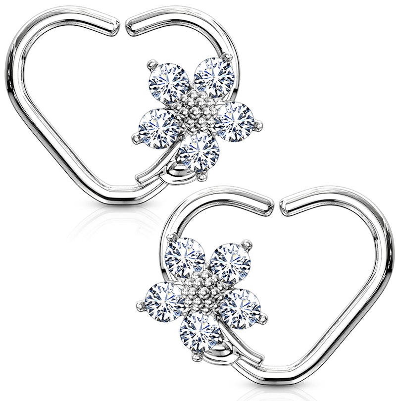 Inimi și flori - nu poți găsi ceva mai frumos și feminin. Această bijuterie le are pe amândouă. În poza alăturată, poți vedea un piercing în formă de inimă și o floare decorată cu pietre cubice de zirconiu. Din moment ce floarea este doar pe o parte, trebuie să decizi și să selectezi pe ce ureche vrei să o porți.