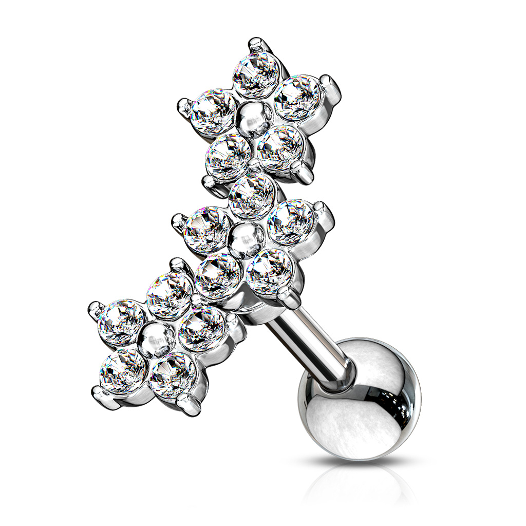 Această bijuterie este perfectă pentru helix, după cum poți vedea în poza modelului alăturat. Trei flori în față crează o arcă subtilă ce urmează forma marginii urechii. Floarea măsoară aproximativ 12 mm din vârf până în capăt, ce consistă din trei mici flori cu cinci petale fiecare. Florile sunt disponibile în trei culori diferite. Toate cele trei modele sunt la fel exceptând culoarea florilor.