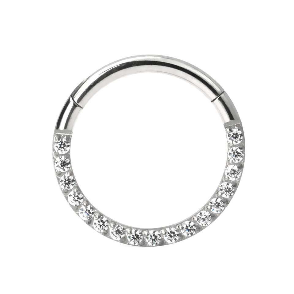 Partea din față a cercelului are un rând de pietre strălucitoare. Ține cont de poziționarea pietrelor atunci când alegi în ce tip de piercing vrei să-l porți. De exemplu, pietrele sunt ideal dispuse pentru piercing de septum sau daith, dar pentru nară s-ar putea să-ți dorești un design în care pietrele sunt orientate spre exterior.