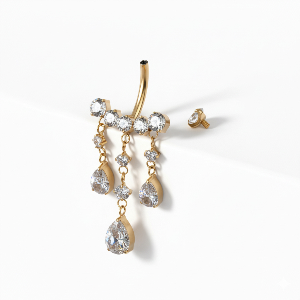 Barbellul pentru buric din titan cu pietre ce atârnă e făcut ca să atragă atenția. Mai multe pietre atârnă în formă de picături delicate, creând mișcare care se schimbă odată cu tine și oferind bijuteriei o prezență de neconfundat. Are detalii fără să fie încărcat și e îndrăzneț fără să-și piardă echilibrul. Disponibil în culorile auriu și argintiu, bijuteria este făcută pentru un look mai elegant.
