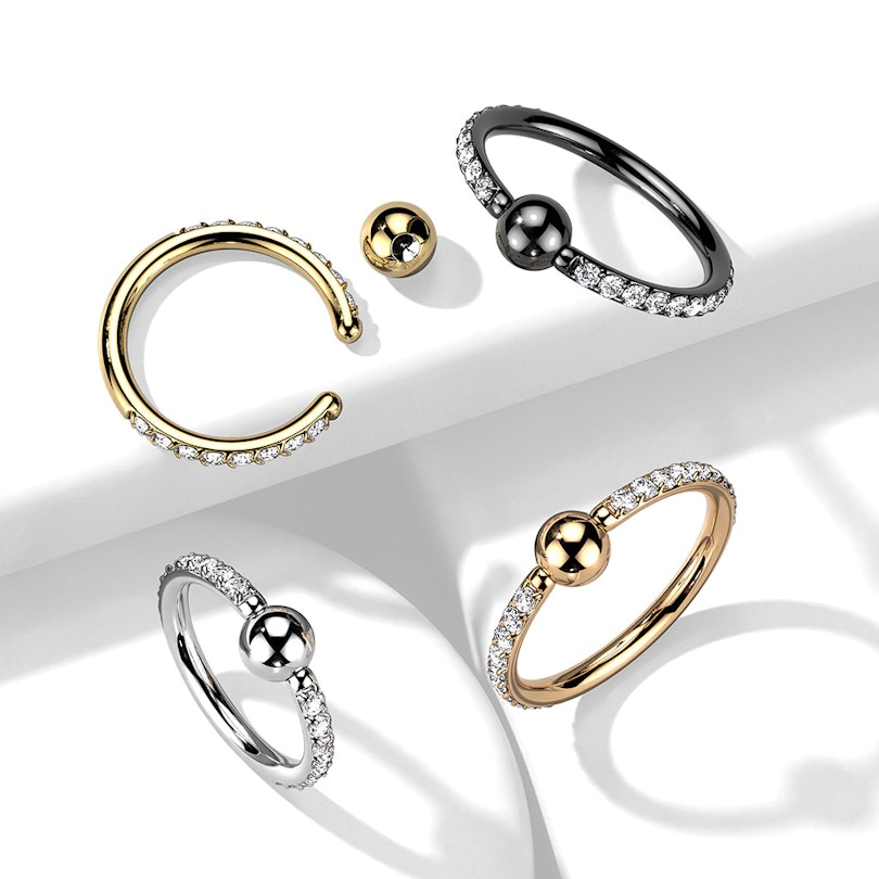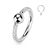 Acest cercel cu bilă captivă nu este culmea extravaganței, dar are suficientă strălucire pentru a-l ieși în evidență. Pietrele frumoase de zirconiu strălucesc pe lateralele marginii exterioare și doar pe partea opusă a bilei nu se află pietre, pentru că aceasta va fi acoperită de piercing.