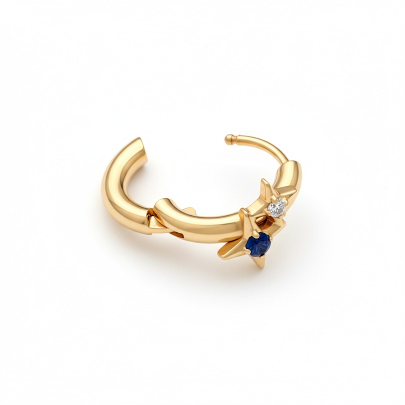Cercelul din titan cu două steluțe aduce o notă jucăușă unei forme huggy clasice. Două mici detalii în formă de stea stau una lângă alta, fiecare cu o piatră colorată prinsă într-o montură cu gheruțe, dând cercelului fix destul caracter fără să fie încărcat. Disponibil în culorile auriu și argintiu e ușor de mixat într-o combinație de ureche mai expresivă.