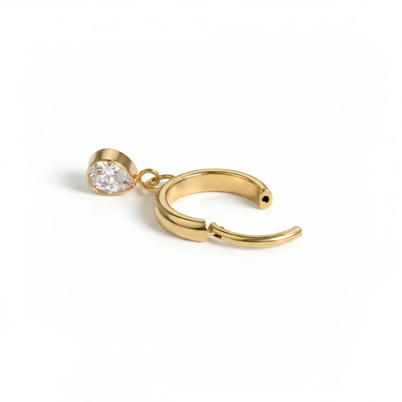 Are un pandant cu piatră de zirconiu în formă de lacrimă incrustată care este atașat de cercel prin două zale delicate. Lacrima în sine măsoară 4,5 mm