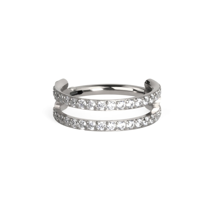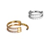 Acest cercel dublu fabulos etalează două semicercuri pavate cu pietre prețioase din zirconiu transparent. Dacă ești fan strălucire și glam, de ce să nu mergi la dublu?