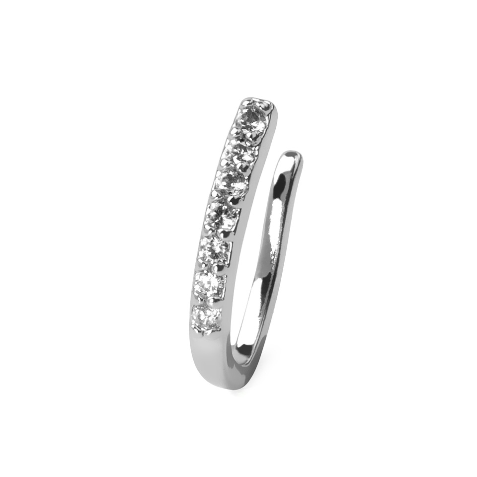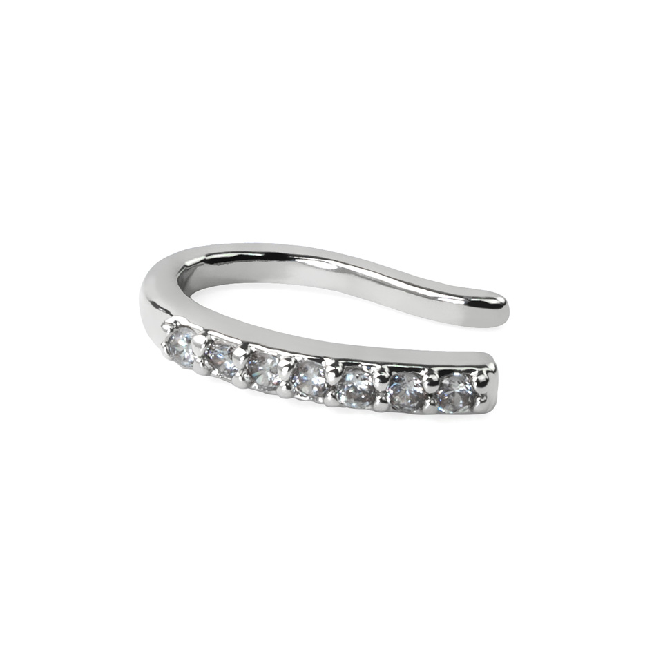 Grosimea bijuteriei este de aproximativ 1 mm sau diamentrul 18 și, după cum poți vedea în poză, are un șir de șapte pietre de zirconiu alb. Deoarece este o bijuterie falsă pentru piercing care nu trece prin piele, întreaga piesă este făcută din alamă și placată pentru un finisaj frumos și strălucitor.