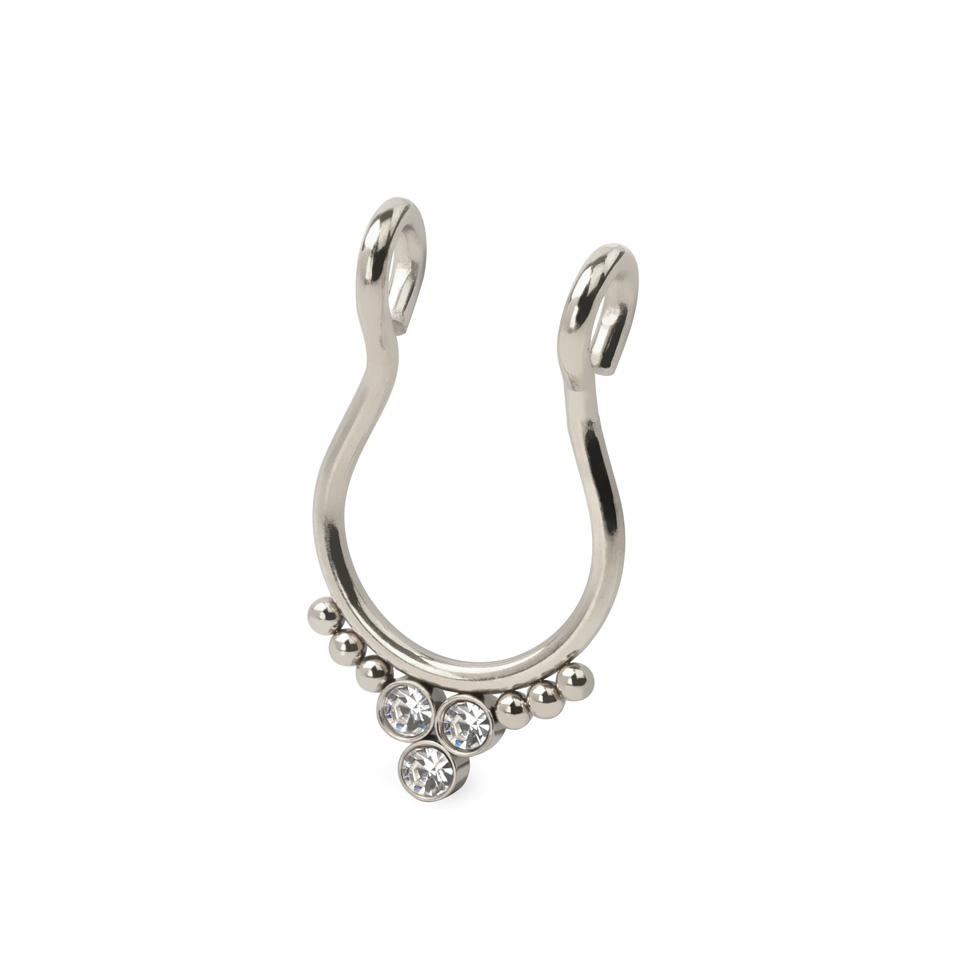 Bijuteriile clip-on sunt modalitatea perfectă de a-ți rafina stilul instant. Un cercel fals de septum se atașează pe septum, în timp ce piercing-ul propriu-zis trece prin el, așa că cine poate să-și dea seama dacă este fals sau nu?! Oricum, bijuteria nu este doar drăguță - ci este și din oțel chirurgical 316L, adică un material pentru bijuterii de piercing sigur și de calitate înaltă.