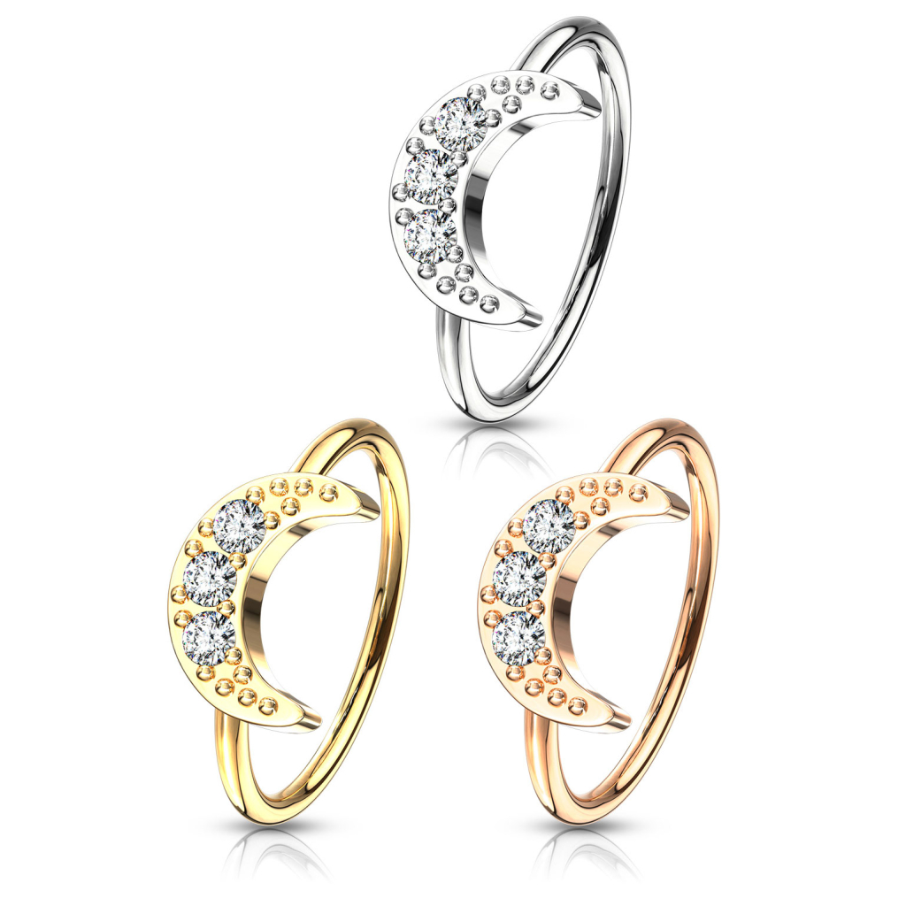 Cercel fără sudură din oțel chirurgical cu lună în creștere. Luna este decorată cu trei pietre transparente în centru, înconjurate de puncte micuțe încrustate.