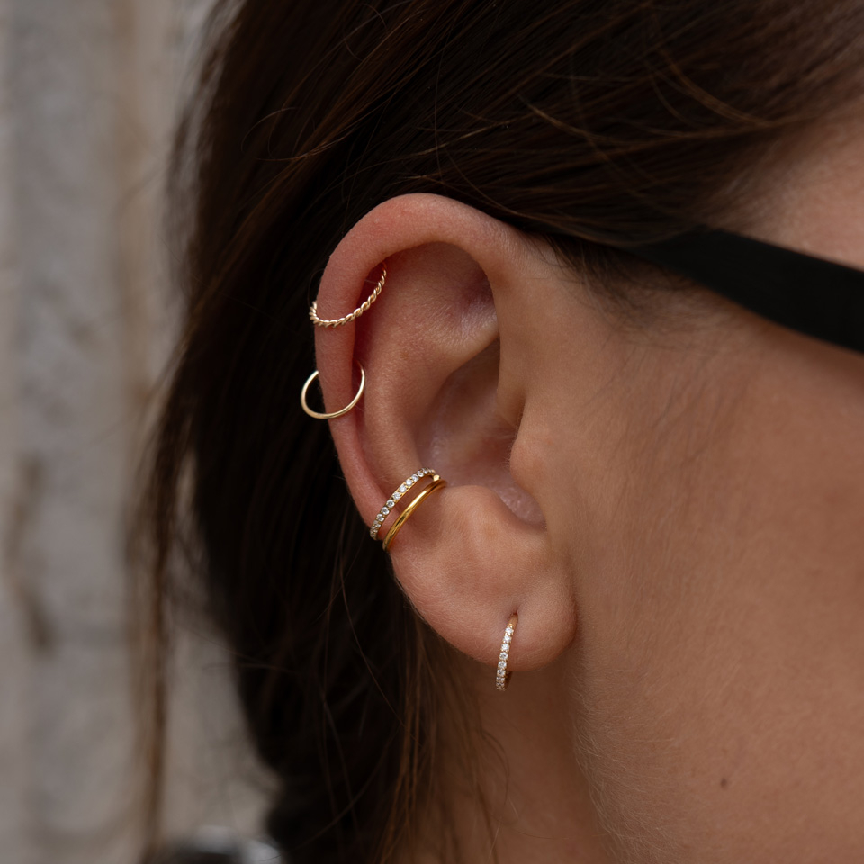 Acest cerc prezintă margini rotunjite, un model răsucit frumos și înainte de toate, un luciu splendid tipic pentru materialul aur solid. Poți alege ce versiune aurie preferi ca tu să iei un cercel care se potrivește perfect cu preferințele tale și culoarea pielii. Acest cercel se deschide și se închide fără efort: răsucește un capăt fără să exagerezi cu puțină forță. Această formă simplă de a deschide și închide permite o inserare ușoară, chiar și pentru cei care nu au multă experiență cu piercing-uri.