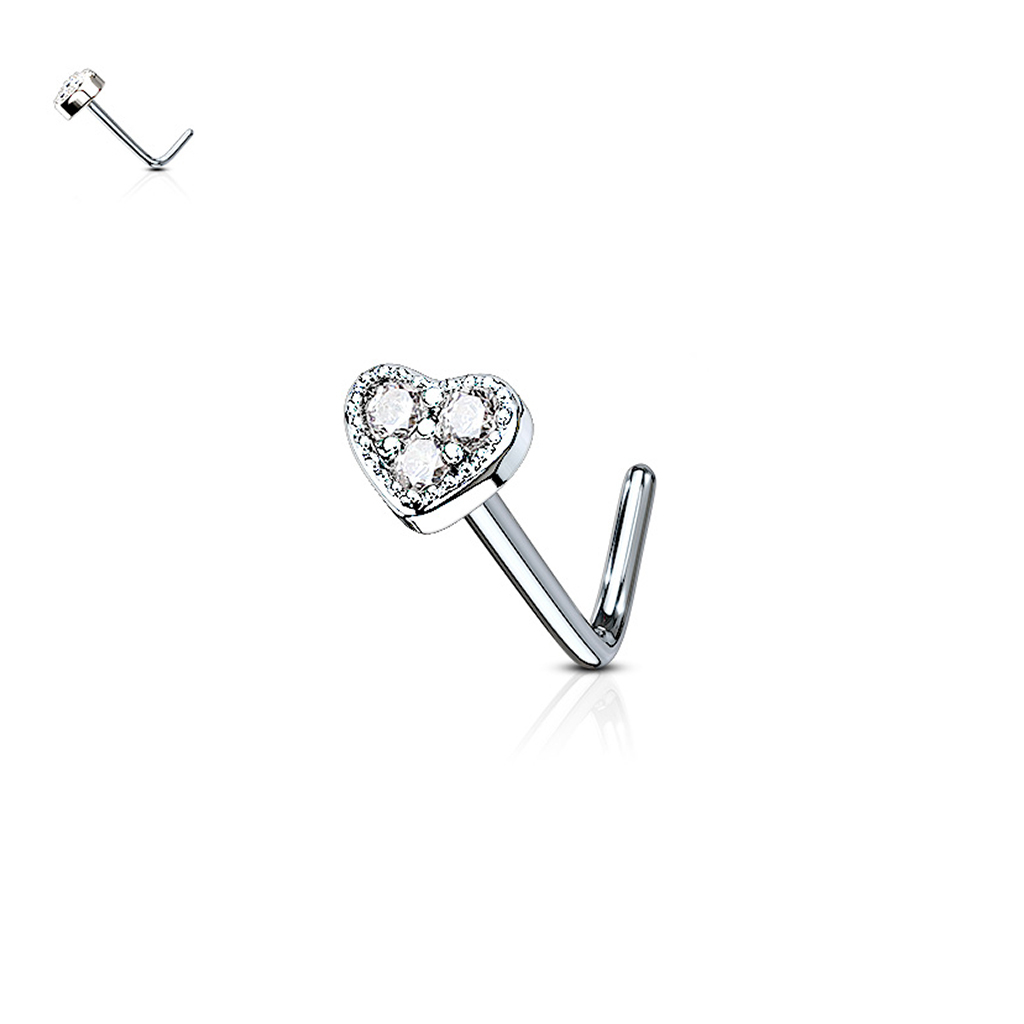Stud-ul de nas are o frumoasă inimă cu trei pietre zirconiu. Tu poți alege dintre diferite culori pentru inimă și pentru pietre. Inima argintie are mai multe posibilități; inimile aurii și aurii roze sunt disponibile doar cu zirconii transparente.