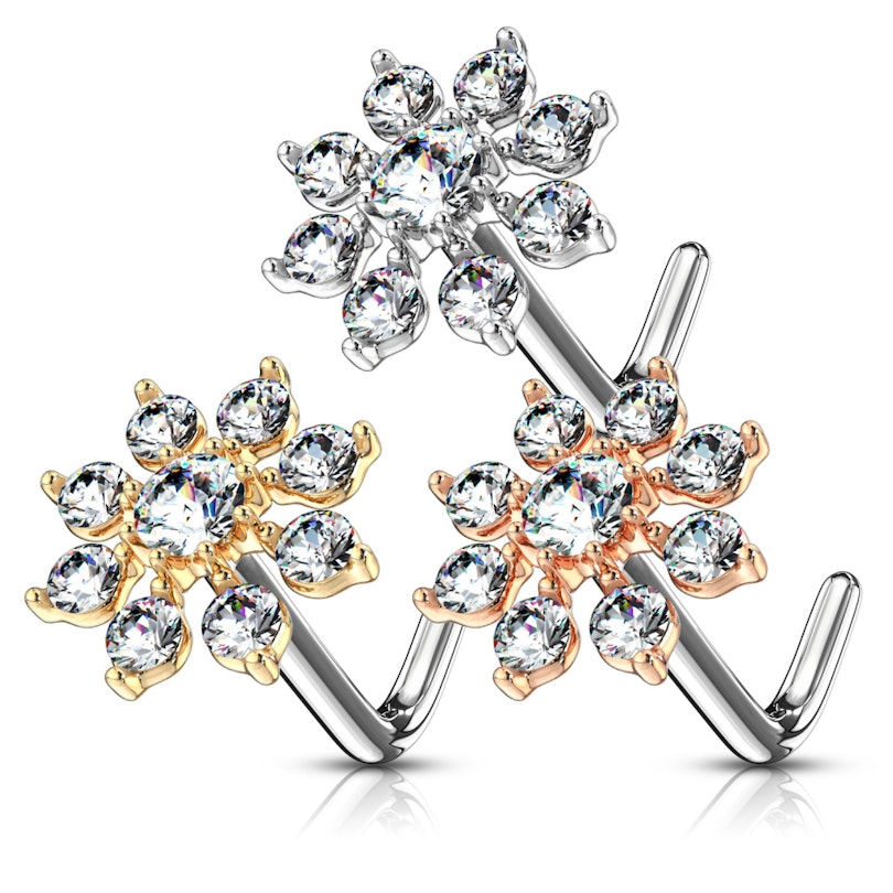 Acest cercel are bara făcută din oțel chirurgical și cu un unghi de 90 de grade, ca să-i creeze forma de L. Aceasta înseamnă că stud-ul se va ajusta nasul tău, Îl oprește să nu cadă când îți miști capul.