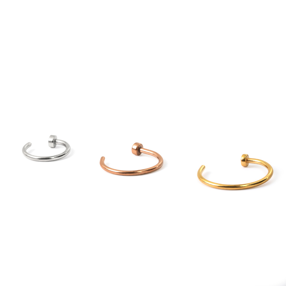 Poți cumpăra acest cercel de nas în modele diferite. Toate au aceeași formă de cercel care constă într-o singură piesă de metal în formă de C.
