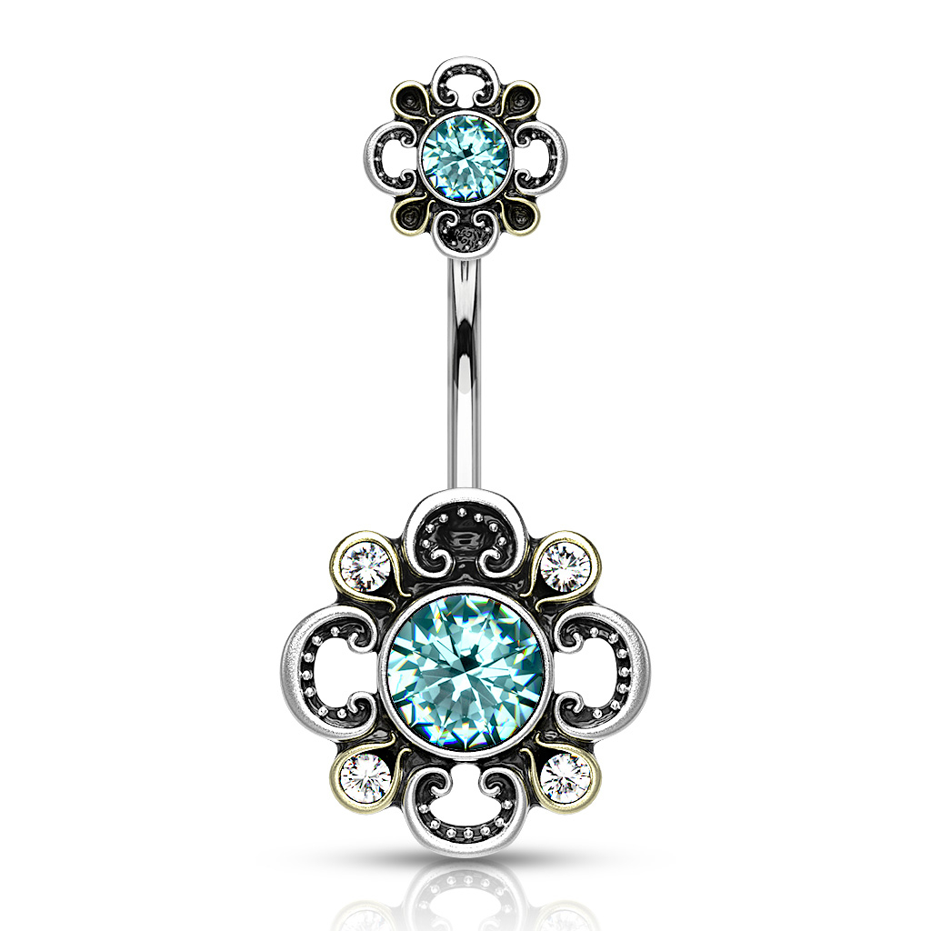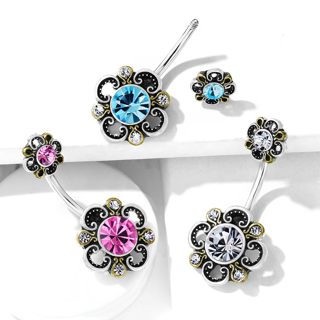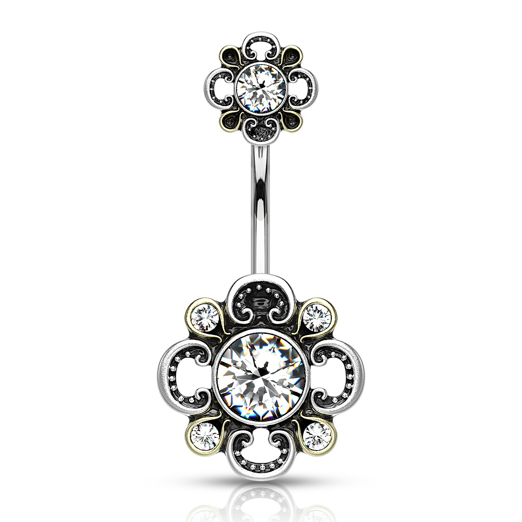 Nume: Cercel ombilical cu floare filigranată cu petalele bătute în pietricele