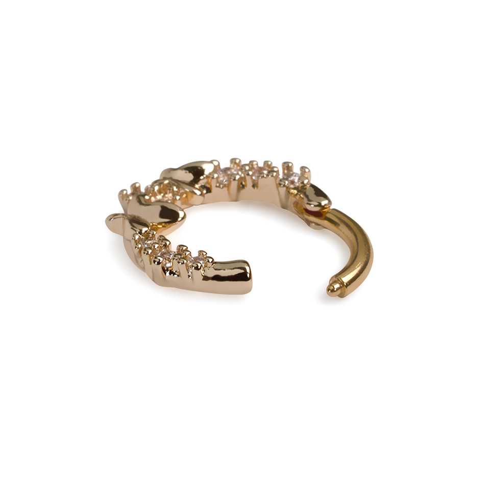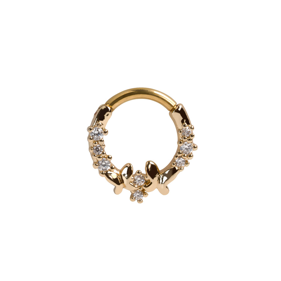 Acest cercel foarte drăgălaș, orientat spre față, are doi fluturi înconjurați de pietre din zirconiu foarte mici. Fiind cu balama, este foarte simplu să-l închizi în piercingul tău.