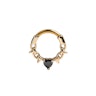Acest cercel orientat spre față are un model cu sârmă ghimpată și în centru o piatră neagră în formă de inimă. Fiind închis cu sistem de balama, este ușor de inserat în piercing.