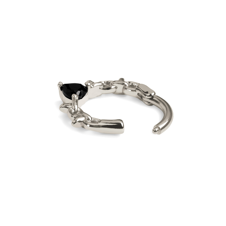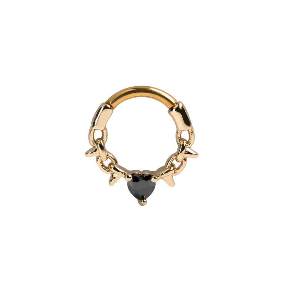 Acest cercel orientat spre față are un model cu sârmă ghimpată și în centru o piatră neagră în formă de inimă. Fiind închis cu sistem de balama, este ușor de inserat în piercing.