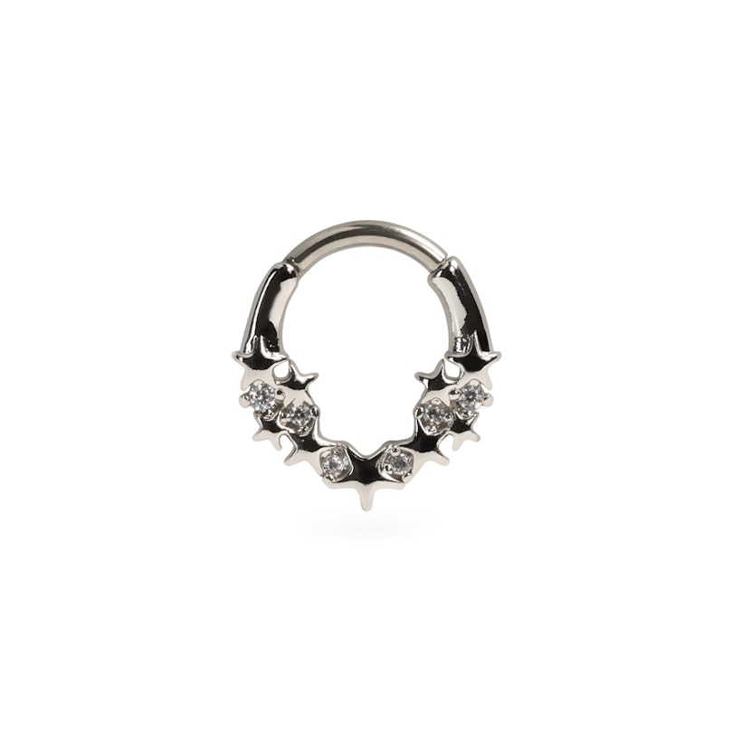 Acel cercel orientat spre față cu stele și lună sunt o super piesă pentru colecția ta. Sistemul de deschidere de tip balama asigură o inserare și o închidere ușoare în piercingul tău.