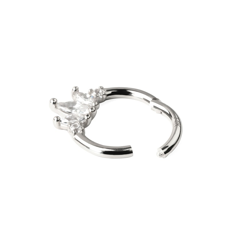 Cercelul are 5 pietre în capăt. Sunt două pietre rotunde pe fiecare parte și trei pietre ovale între ele. Piatra ovală din mijloc este mai mare decât restul. Împreuna formează o frumoasă cascadă de pietre transparente care înfrumusețează orice piercing.