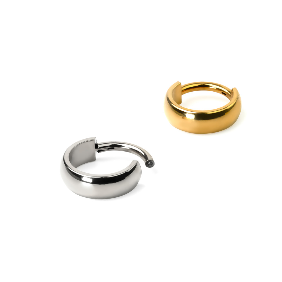 Acest cercel din titan cu balama are un arc mare orientat spre exterior și este o adevărată bijuterie statement. Este disponibil în 4 culori: argintiu, negru, rose gold, și auriu.