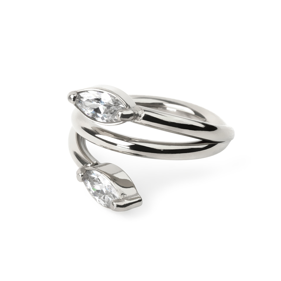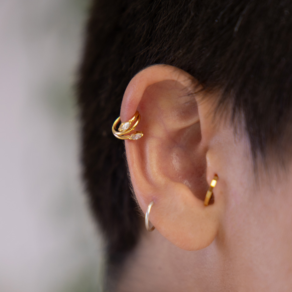 Cercel delicat cu balama, din oțel chirurgical. Aceste cercel frumos are două pietre din zirconiu cu tăietură marchiză care dau impresia unor frunze de viță-de-vie. Disponibilă la alegere cu diametrele 8 mm și 10 mm, în finisaje auriu sau lucios, această bijuterie versatilă se va potrivi foarte frumos în toate tipurile de piercinguri de ureche, mai ales în piercingurile de cartilaj, cum ar fi rook sau helix.