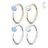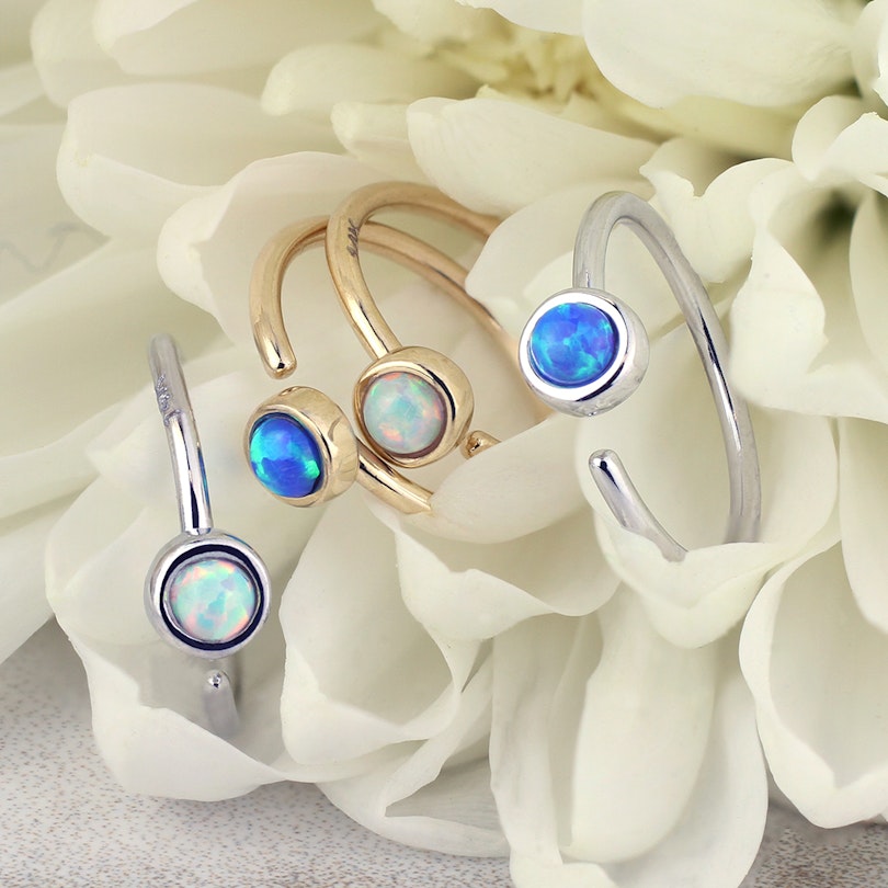 Cercelul vine cu o piatră de opal sintetică cu diametrul de 1/8 inches (2.5 mm). În plus, alege tipul de aur, mai poși alege și culoarea opalului dintre alb sau albastru. Piatra albă de opal are nuanșe roșiatice, galbene și verzi, dar albul este cea mai poeminentă culoare. Cea albastră are nuanțe de albastru deschis, turcuaz și așbastru închis. Poți purta acest frumos cercel în multe piercing-uri diferite, atâta timp cât mărimile se potrivesc. Poți vedea mărimile sub Informații Adiționale.