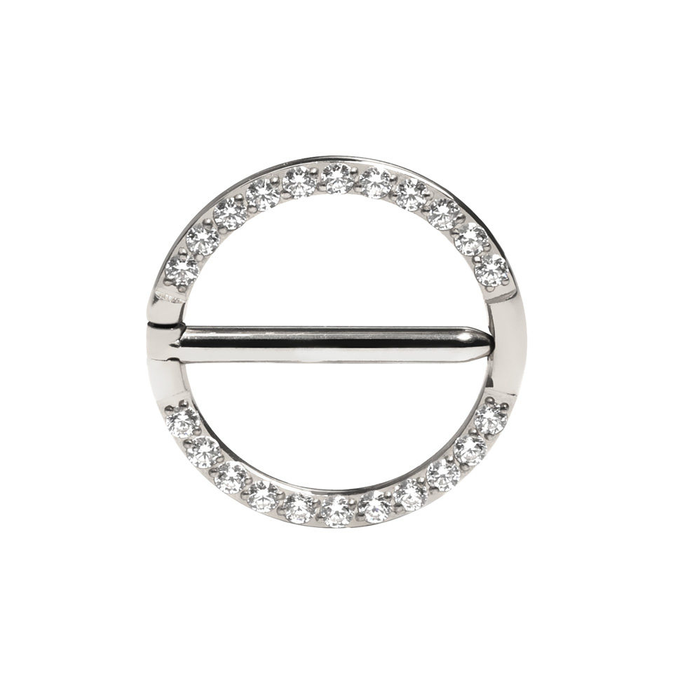 Acest clicker de sân în formă de cerc realizat din titan are pietre de zirconiu pave care vor încadra foarte frumos sfârcul. Este realizat din titan, deci este hipoalergenic și foarte confortabil de purtat. Este disponibil în două lungimi diferite, de 12 mm și 14 mm, în finisajele auriu și argintiu.