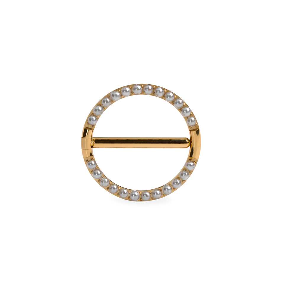 Clickerul de sân din titan incrustat cu perle demonstrează că perlele nu sunt doar pentru coliere. Un cerc întreg de perle fixate prin gheruțe în finisaje auriu sau argintiu îți încadrează piercingul cu multă atitudine.