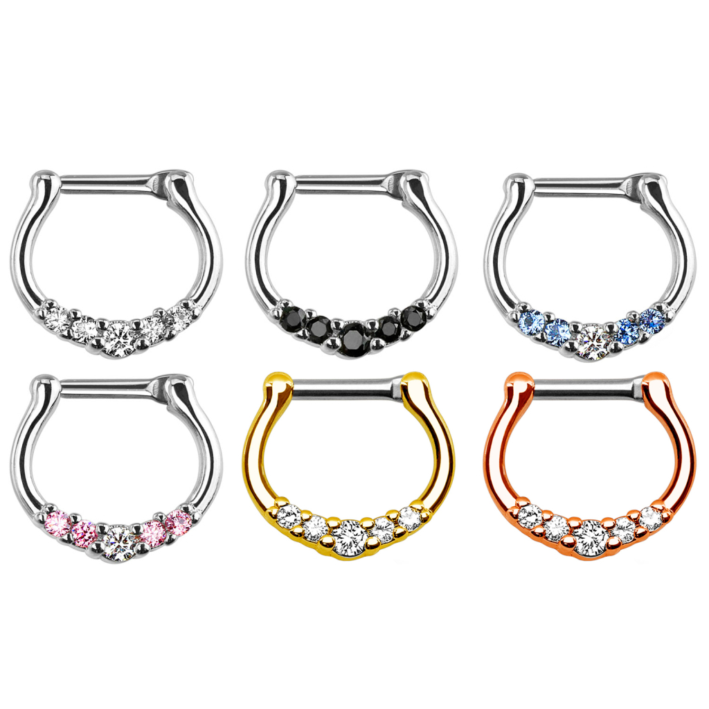 Clicker de septum feminin și frumos făcut din oțel chirurgical solid cu cinci pietre frumoase. Pietrele rotunde sunt în partea de jos ce arată ca o arcă, cu niște curbe ce emană feminitate. Piatra din mijloc este mai mare, în timp ce pietrele mai mici un aranjate gradual și simetric de ambele părți.
