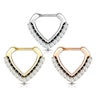 Frumosul design curbat al acestui clicker se aseamănă cu un V îndulcit. Ambele părți ale literei V sunt acoperite cu pietre mici pe un fundal negru emailat ce îi oferă bijuteriei un look antichizat. Bara cu balama care trece prin piercing-ul tău este făcută din oțel chirurgical, în timp ce restul bijuteriei este creat din alamă. Întreaga piesă a fost ulterior suflată cu diferite culori ca tu să poți alege dintre trei culori diferite.