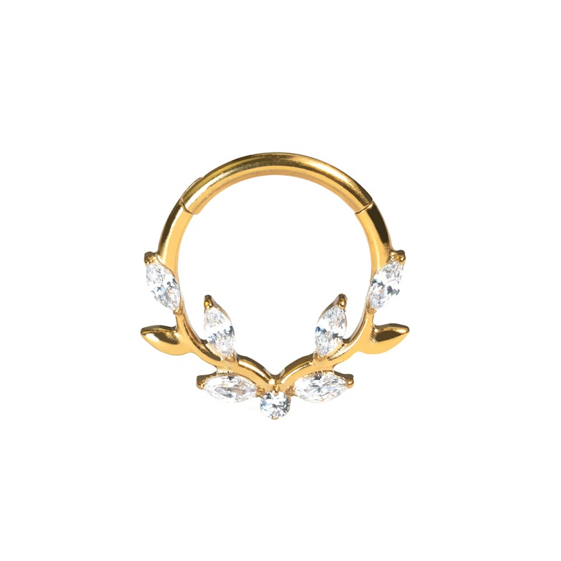 Acest clicker premium orientat spre față are un model foarte frumos cu frunză de vie și va arăta minunat în piercinguri ca daith și septum. Fiind fabricat din titan, este rezistent și hipoalergenic. O piesă super pentru colecția ta.