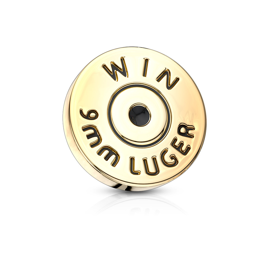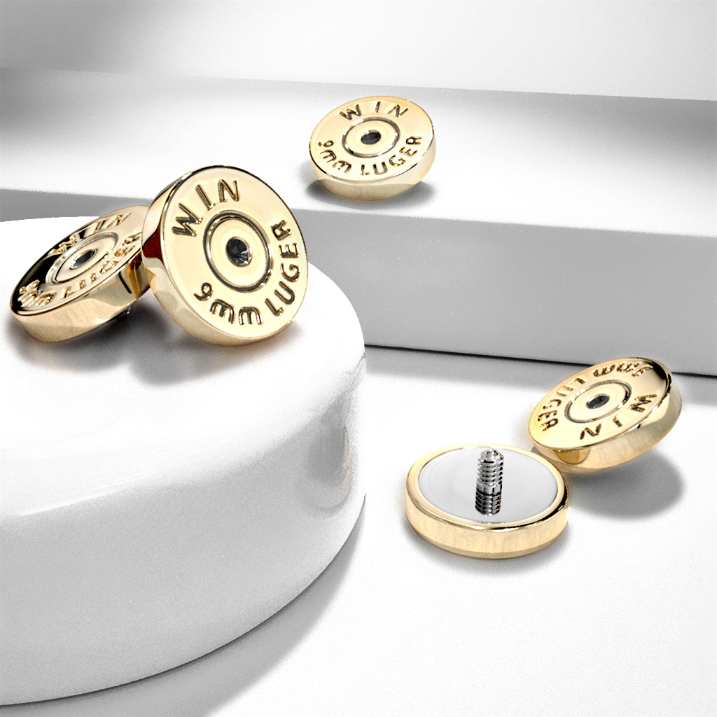 Baza cartușului, care este materialul ce intră în contact cu pielea ta, este făcut din oțel chirurgical, și cartușul este creat din alamă și apoi suflat cu o culoare aurie ce îl face să arate ca un cartuș adevărat. Măsurile vârfului sunt 7 mm - deci este destul loc pentru a grava textul care îl face să arate real - îl poți vedea în poza prezentată pe această pagină.