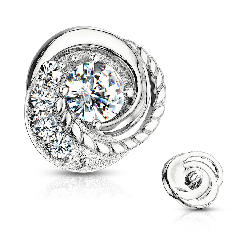 Acest top dermal este unul dintre cele mai interesante și complexe. Pe de-o parte, vei observa un model frumos împletit care începe din interior spre exterior și se îndreaptă spre centru. Pe de altă parte, un canal de pietre multiple este plasat, de asemenea, spre centru. Nu în ultimul rând, vei obersa o piatră centrală mare și strălucitoare care conferă vârfului dermal un finisaj excepțional.