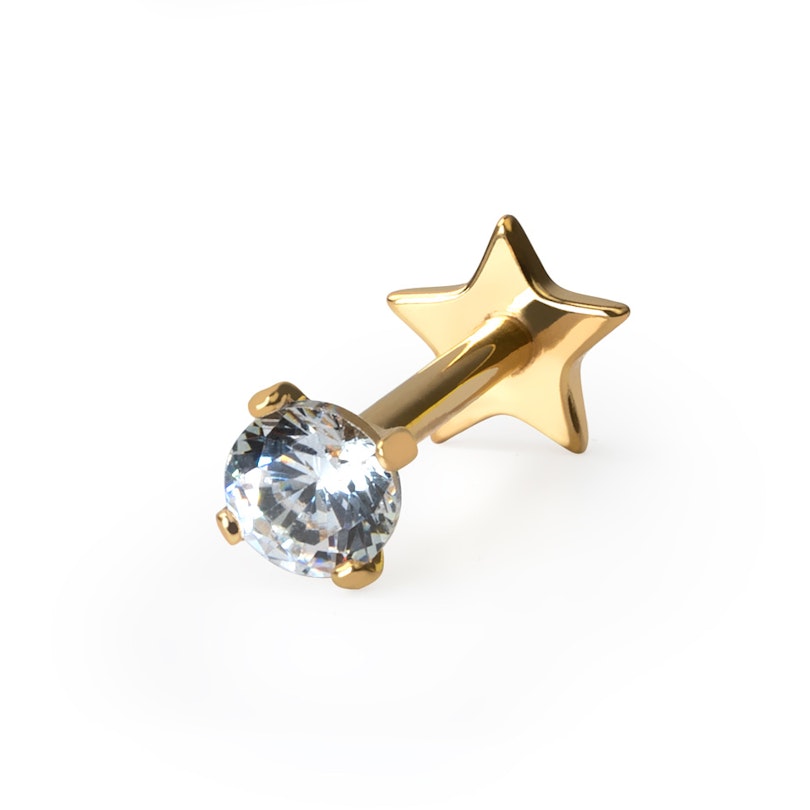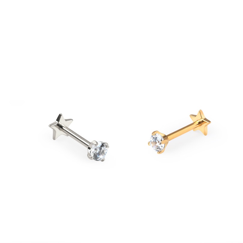Acest labret din titan are un spate plat în formă de stea, perfect pentru piercinguri cum ar fi helix sau lob, unde spatele bijuteriei este vizibil.